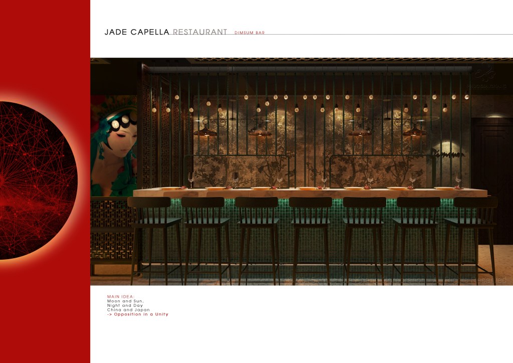 Từ đó, NTK lập luận 2 nhà hàng theo 2 hướng thiết kế tưởng chừng như đối lập nhau như Mặt trăng (Ban đêm)| Mặt trời (Ban ngày), nhưng thực chất lại là 2 mặt của 1 đồng xu, như hình ảnh thái cực bao gồm âm & dương không bao giờ tách rời nhau mà gắn kết chặt chẽ trong 1 thể thống nhất, nhằm tôn vinh triết lý, văn hóa phương Đông