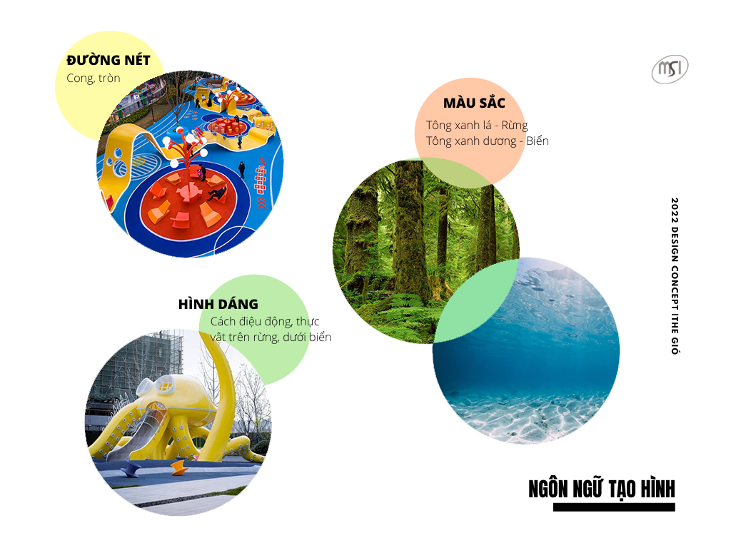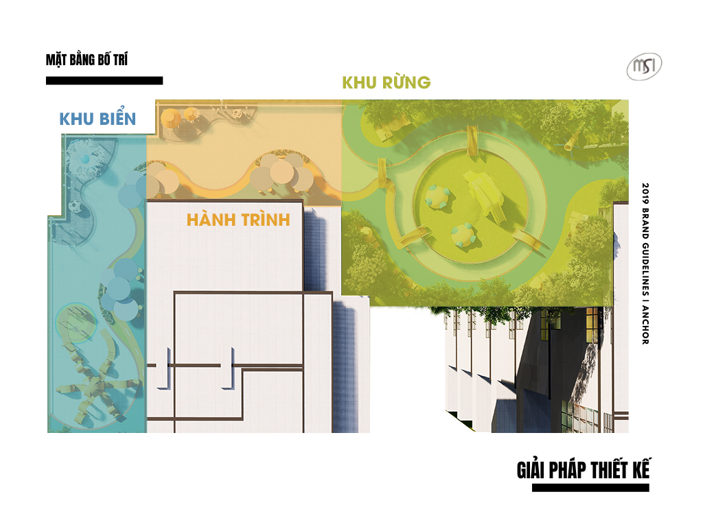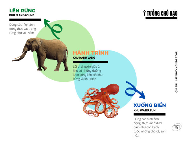 Diễn giải ý tưởng: Chung cư tên The Gió – 1 yếu tố trong tự nhiên, và khi liên hệ với nhiệm vụ thiết kế cho khu ướt- khu khô cho 1 khu vui chơi nước, NTK liên hệ đến Hành trình Lên Rừng- Xuống Biển, như là một hành trình của những cơn gió.